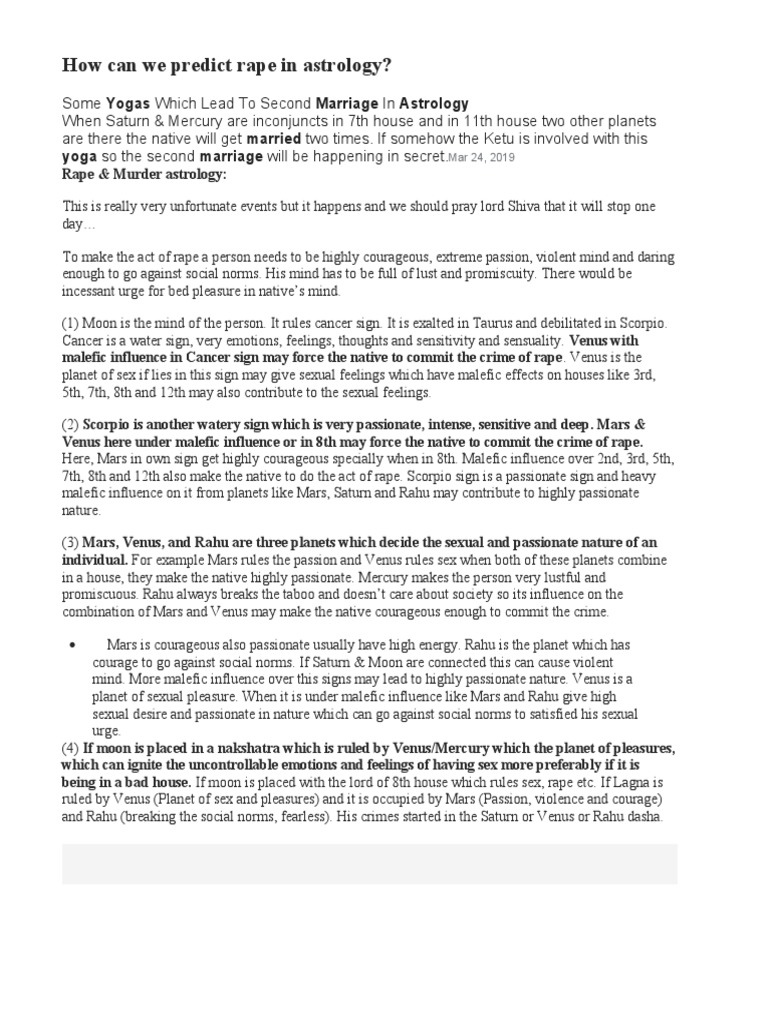 Murder yoga in astrology. 27 Yogas & 11 Karanas of Panchangam - Astrology Vedic Astrology suggests few benefits of knowing these 5 Panchang Elements on Daily Basis : • Uttering the Vaara (Day of the Week) will help one to enjoy longevity • Uttering the Nakshatra (Star the Moon is in) will help one dissolve bad karmas • Uttering the Tithi (Moon Phase) will help one enjoy immense wealth Sudden Unnatural Deaths in Astrology - Speaking Tree Malefic moon ---denotes death by drowning in water, loss of blood, serious bronchial problems, and mental worries. Malefic Sun ---sudden death by myocardial infarction, fire etc. Rahu/Ketu ... Bandhan Yoga - Jail Yog Causes and Solutions - Vinay Bajrangi To see a Bandhan Yoga or Jail Yoga/ imprisonment in horoscope, one needs to analyze twelfth house in the horoscope. A person loses a court case and is sentenced to prison. This means that when the sixth house fails to protect the native the complementary house to it (twelfth house) gets activated and forces the native to confinement. Mangal/ Manglik Dosha In Horoscope and Remedies 1.Sit in any pose or asana, 2. Close your eyes, 3. Take three long breath with a slow exhalation, 4. First, concentrate on your every natural inhalation and exhalation for a minimum of 5 minutes, your body will become very calm, 5.